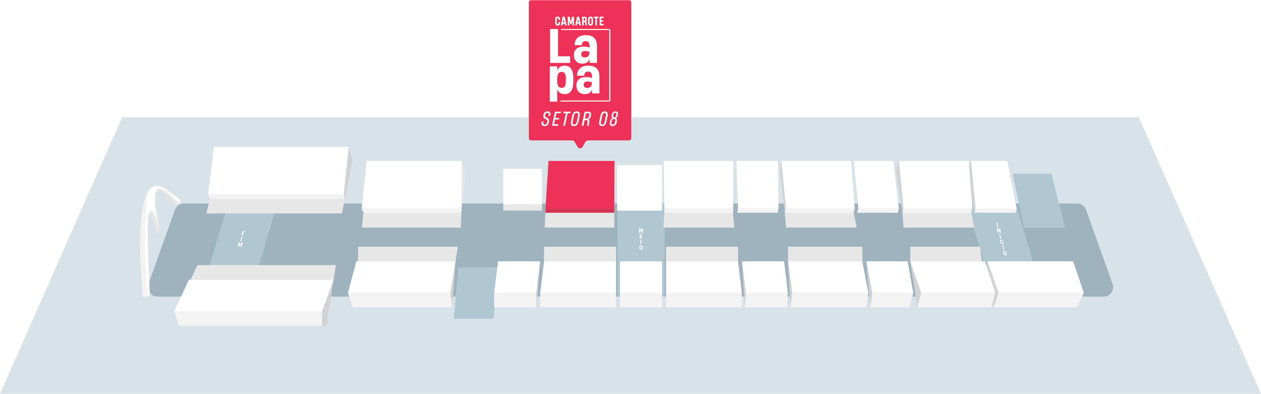 No ponto mais nobre da Sapucaí — setor 8, nível 01 da Sapucaí. O camarote vai do 1 ao 12, com capacidade para 300 pessoas diariamente.